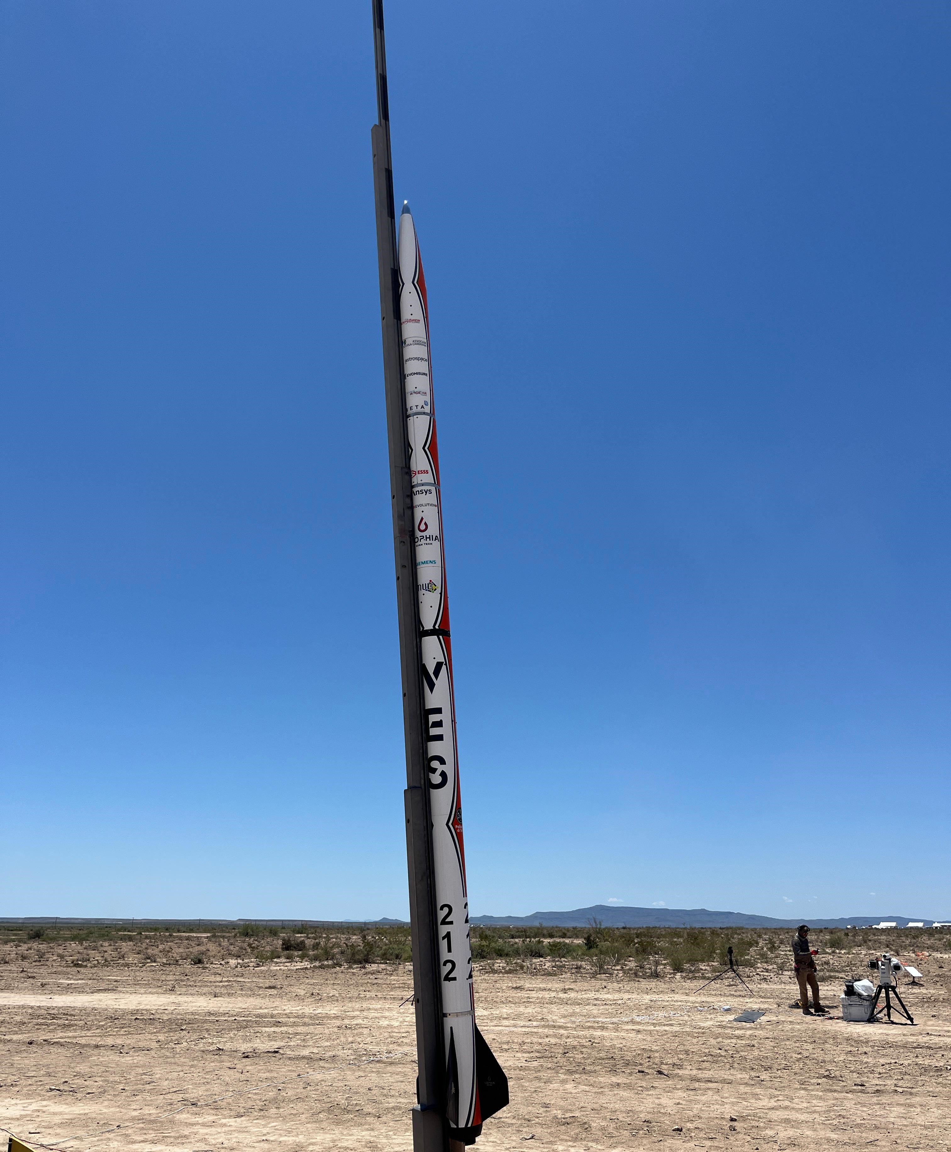 July 13, 2025On July 13th, 2025, in Midland, Texas, VES Mark II attempted its supersonic launch targeting 9000m. Unfortunately, a CATO (Catastrophic Aborted Take-Off) occurred after ignition due to a malfunctioning COTS motor, likely stemming from a manufacturer's defect.